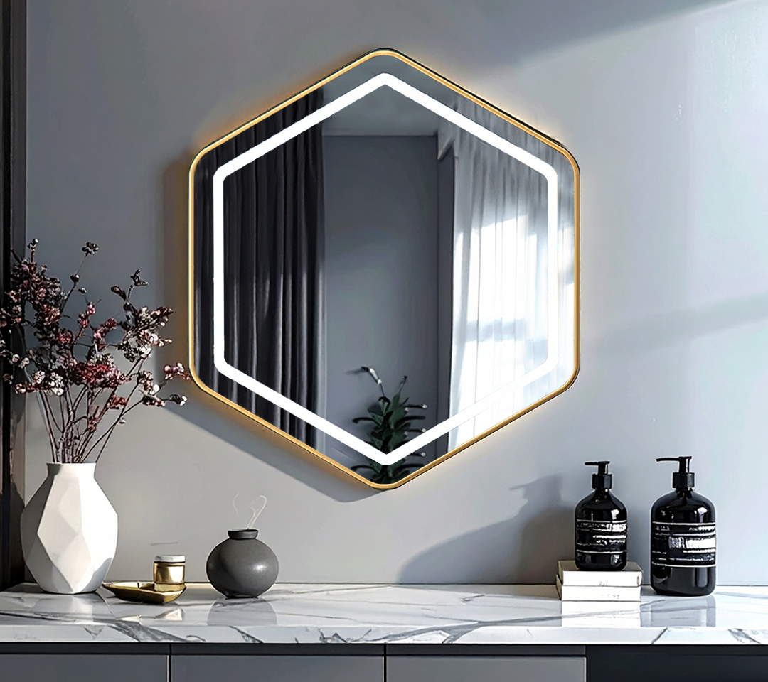 - Diseño Vanguardista: La forma hexagonal rompe con lo convencional, ofreciendo una estética única que se adapta perfectamente a espacios contemporáneos y de diseño. Su elegante marco dorado o bronceado le da un toque de lujo y distinción.