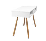 - Materiales: Superficie de madera con acabado blanco mate, combinada con patas de madera en tono natural, lo que aporta un estilo cálido y sofisticado.