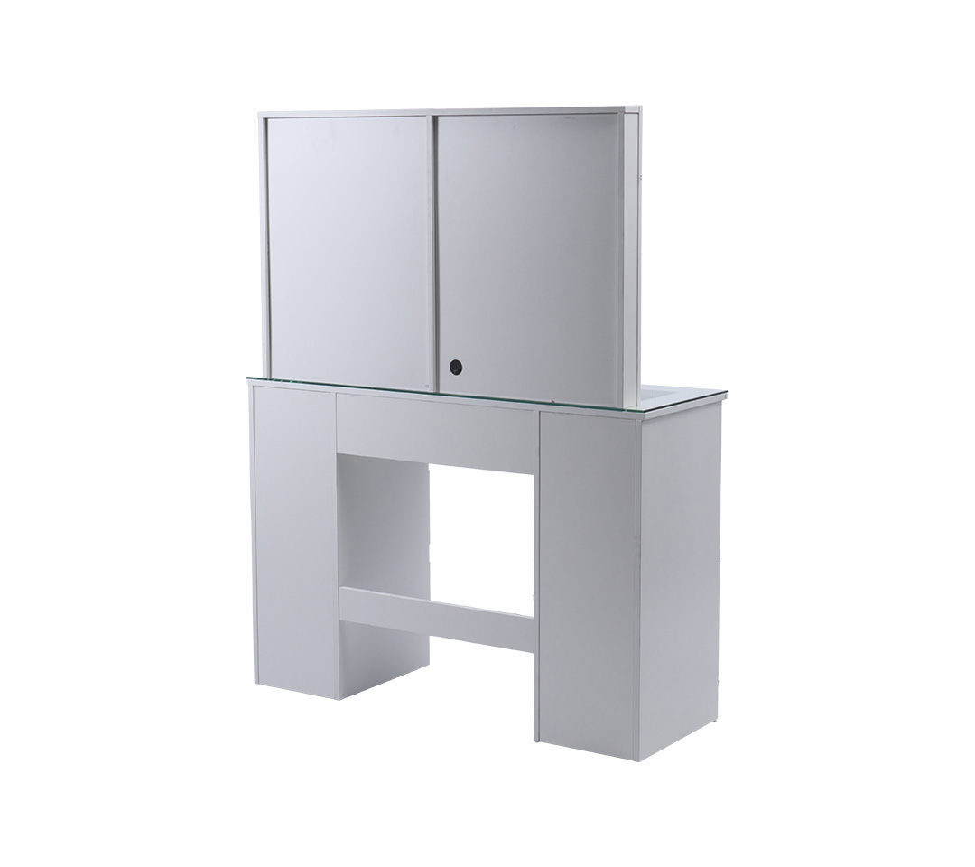 - Superficie de Vidrio: La parte superior de la mesa es de vidrio, permitiendo una vista clara del cajón central, perfecto para almacenar productos de belleza pequeños.