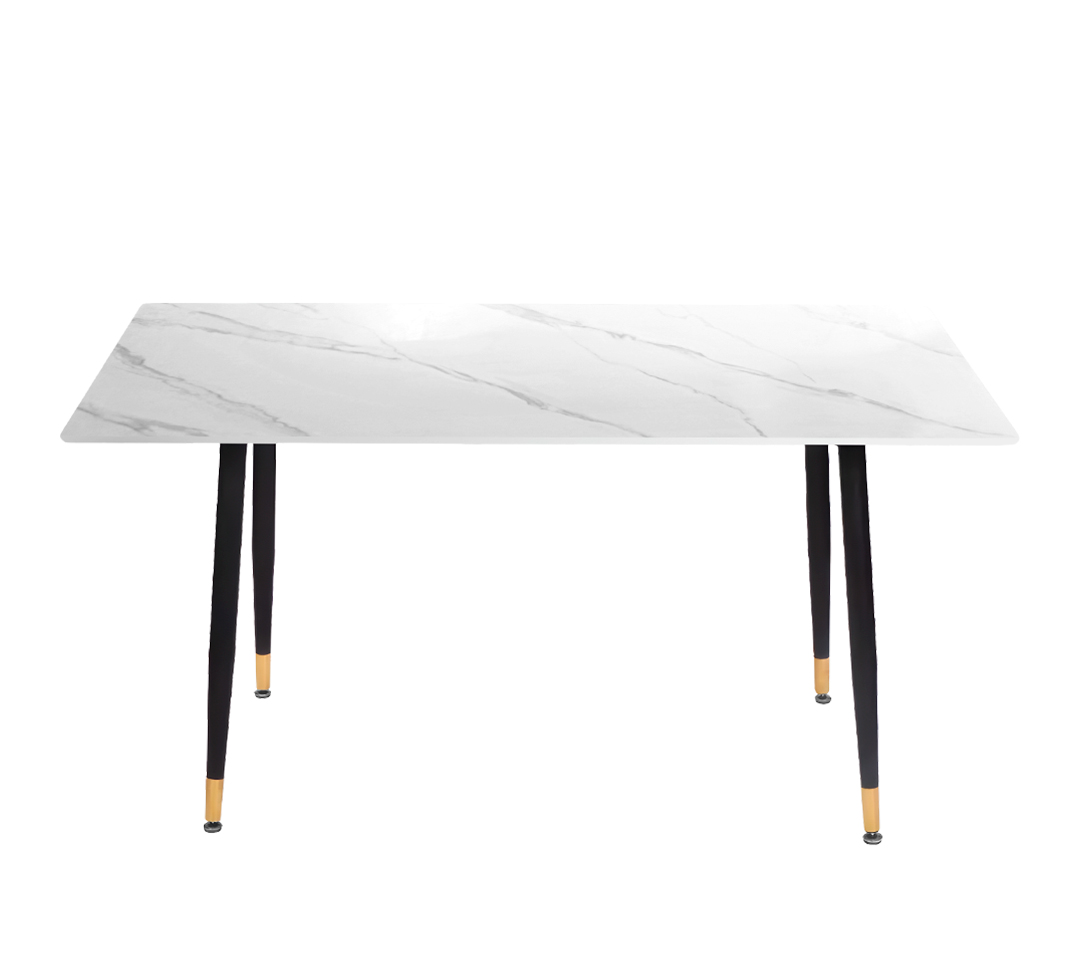 Esta mesa destaca por su diseño contemporáneo que incluye líneas doradas en la superficie, aportando un toque de distinción y exclusividad. Sus patas delgadas y estilizadas en color negro, adornadas con detalles dorados en la parte inferior, no solo garantizan estabilidad y durabilidad, sino que también complementan su atractivo estético.