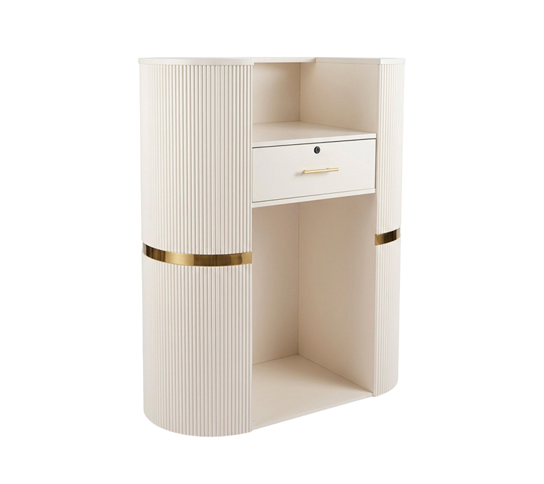 Estructura Curvilínea: Los paneles laterales curvos en forma de media luna rompen con las líneas rectas tradicionales, creando un flujo visual suave y acogedor que guía a tus clientes hacia el área de bienvenida.