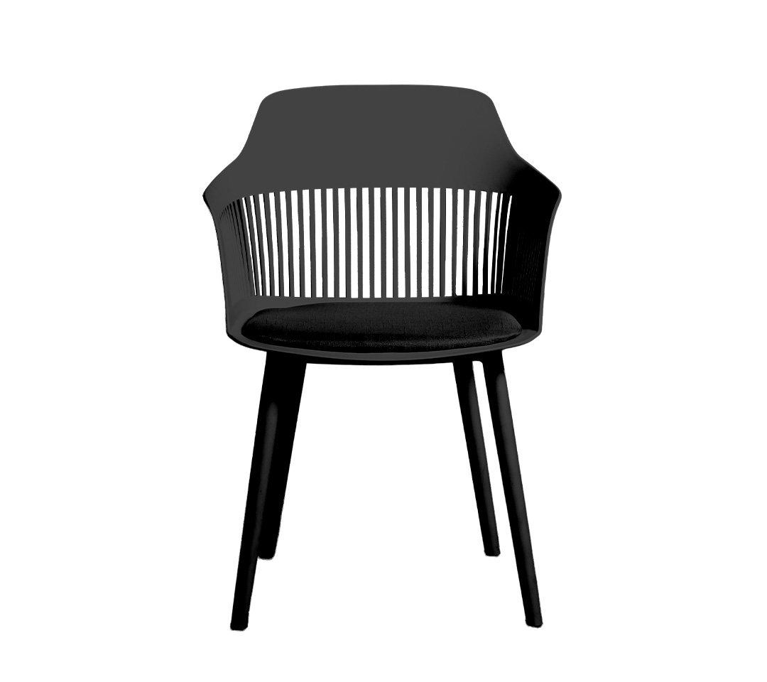 La imagen muestra una elegante silla negra con patas delgadas y un diseño moderno en el respaldo con ranuras verticales, destacando por su simplicidad y estilo contemporáneo. Su presencia en cualquier comedor o espacio de trabajo es sinónimo de un ambiente refinado y con carácter