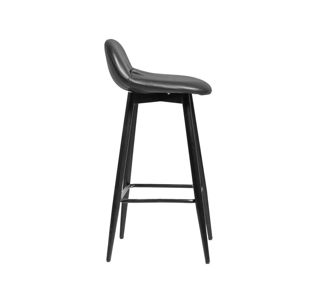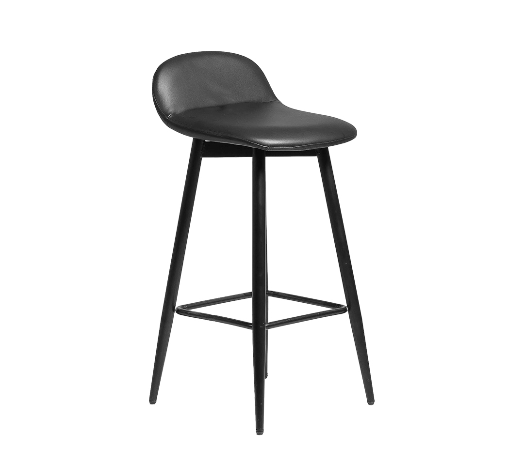 Las patas delgadas y pintadas de negro, forman una base sólida y auténtica, complementando la estética moderna del taburete. Además, el reposapiés incorporado, formado por una barra metálica que conecta las patas, ofrece un soporte adicional y un detalle práctico que realza el diseño general.